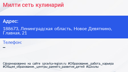 Милти, сеть кулинарий по адресу 188673, Ленинградская область, Новое Девяткино, Главная, 21 в дальнейшем Организация, размещена в следующих категориях: