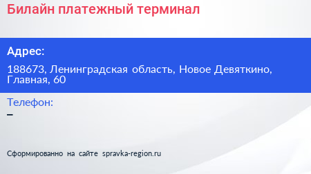 Билайн, платежный терминал по адресу 188673, Ленинградская область, Новое Девяткино, Главная, 60 в дальнейшем Организация, размещена в следующих категориях: