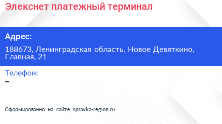 Элекснет, платежный терминал по адресу 188673, Ленинградская область, Новое Девяткино, Главная, 21 в дальнейшем Организация, размещена в следующих категориях: