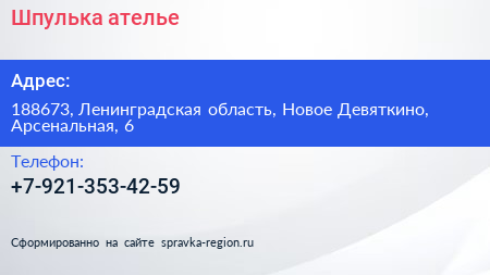 Шпулька, ателье по адресу 188673, Ленинградская область, Новое Девяткино, Арсенальная, 6 в дальнейшем Организация, размещена в следующих категориях: