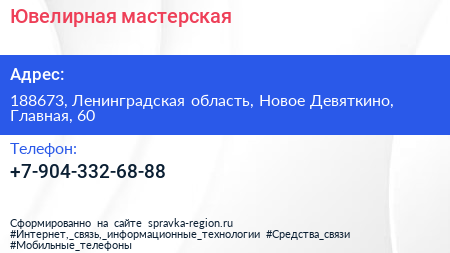 Ювелирная мастерская по адресу 188673, Ленинградская область, Новое Девяткино, Главная, 60 в дальнейшем Организация, размещена в следующих категориях: