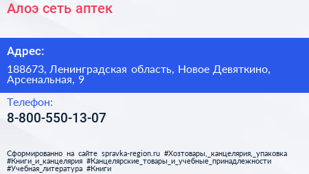 Алоэ, сеть аптек по адресу 188673, Ленинградская область, Новое Девяткино, Арсенальная, 9 в дальнейшем Организация, размещена в следующих категориях: