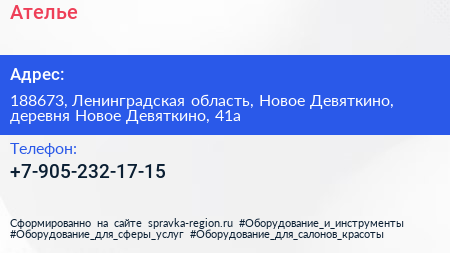 Ателье по адресу 188673, Ленинградская область, Новое Девяткино, деревня Новое Девяткино, 41а в дальнейшем Организация, размещена в следующих категориях:
