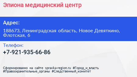 Эпиона, медицинский центр по адресу 188673, Ленинградская область, Новое Девяткино, Флотская, 6 в дальнейшем Организация, размещена в следующих категориях: