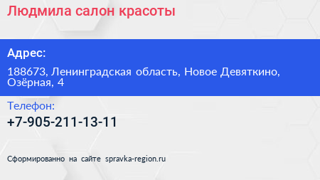 Людмила, салон красоты по адресу 188673, Ленинградская область, Новое Девяткино, Озёрная, 4 в дальнейшем Организация, размещена в следующих категориях:
