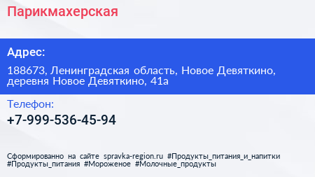 Парикмахерская по адресу 188673, Ленинградская область, Новое Девяткино, деревня Новое Девяткино, 41а в дальнейшем Организация, размещена в следующих категориях:
