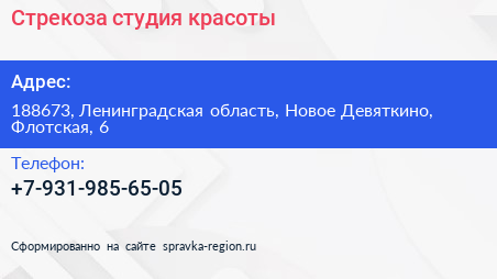 Стрекоза, студия красоты по адресу 188673, Ленинградская область, Новое Девяткино, Флотская, 6 в дальнейшем Организация, размещена в следующих категориях:
