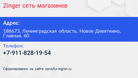 Zinger, сеть магазинов по адресу 188673, Ленинградская область, Новое Девяткино, Главная, 60 в дальнейшем Организация, размещена в следующих категориях: