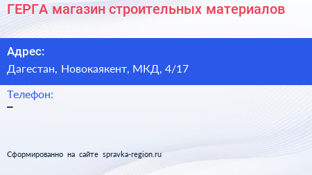 ГЕРГА, магазин строительных материалов по адресу Дагестан, Новокаякент, МКД, 4/17 в дальнейшем Организация, размещена в следующих категориях: