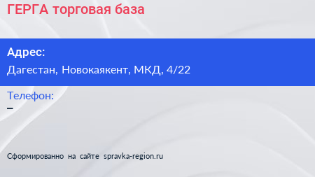 ГЕРГА, торговая база по адресу Дагестан, Новокаякент, МКД, 4/22 в дальнейшем Организация, размещена в следующих категориях: