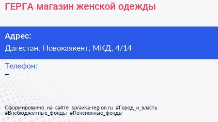 ГЕРГА, магазин женской одежды по адресу Дагестан, Новокаякент, МКД, 4/14 в дальнейшем Организация, размещена в следующих категориях: