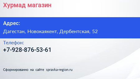 Хурмад, магазин по адресу Дагестан, Новокаякент, Дербентская, 52 в дальнейшем Организация, размещена в следующих категориях: