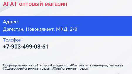 АГАТ, оптовый магазин по адресу Дагестан, Новокаякент, МКД, 2/8 в дальнейшем Организация, размещена в следующих категориях: