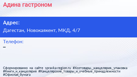 Адина, гастроном по адресу Дагестан, Новокаякент, МКД, 4/7 в дальнейшем Организация, размещена в следующих категориях: