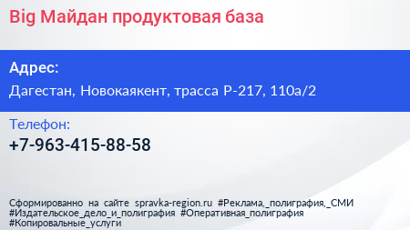 Big Майдан, продуктовая база по адресу Дагестан, Новокаякент, трасса Р-217, 110а/2 в дальнейшем Организация, размещена в следующих категориях: