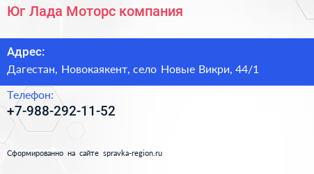 Юг-Лада-Моторс, компания по адресу Дагестан, Новокаякент, село Новые Викри, 44/1 в дальнейшем Организация, размещена в следующих категориях: