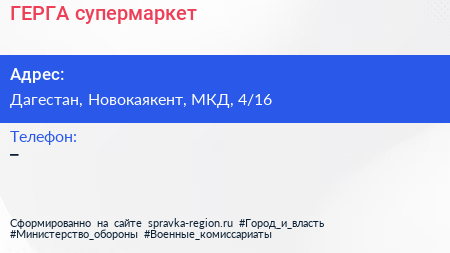 ГЕРГА, супермаркет по адресу Дагестан, Новокаякент, МКД, 4/16 в дальнейшем Организация, размещена в следующих категориях: