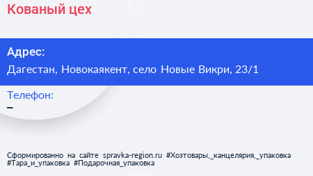 Кованый цех по адресу Дагестан, Новокаякент, село Новые Викри, 23/1 в дальнейшем Организация, размещена в следующих категориях:
