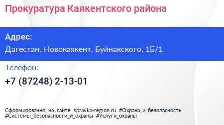 Прокуратура Каякентского района по адресу Дагестан, Новокаякент, Буйнакского, 1Б/1 в дальнейшем Организация, размещена в следующих категориях: