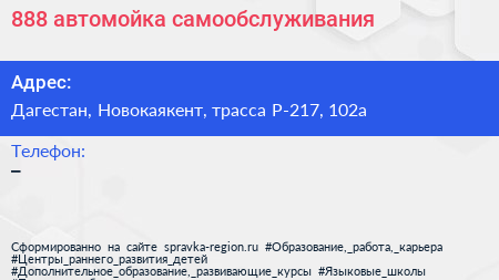 888, автомойка самообслуживания по адресу Дагестан, Новокаякент, трасса Р-217, 102а в дальнейшем Организация, размещена в следующих категориях: