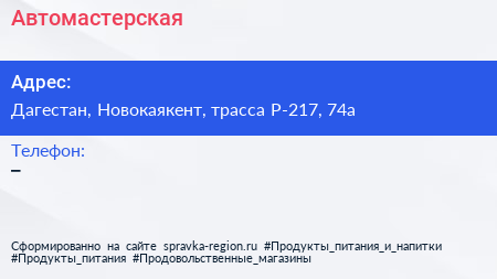 Автомастерская по адресу Дагестан, Новокаякент, трасса Р-217, 74а в дальнейшем Организация, размещена в следующих категориях: