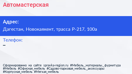 Автомастерская по адресу Дагестан, Новокаякент, трасса Р-217, 100а в дальнейшем Организация, размещена в следующих категориях: