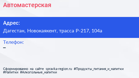 Автомастерская по адресу Дагестан, Новокаякент, трасса Р-217, 104а в дальнейшем Организация, размещена в следующих категориях: