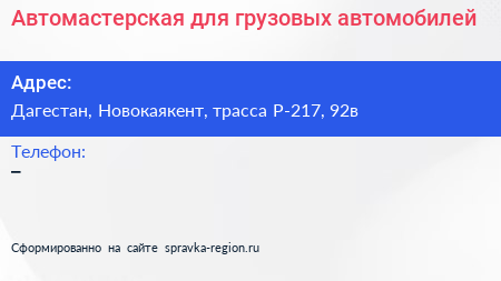 Автомастерская для грузовых автомобилей по адресу Дагестан, Новокаякент, трасса Р-217, 92в в дальнейшем Организация, размещена в следующих категориях: