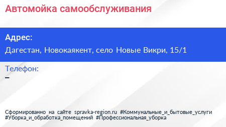 Автомойка самообслуживания по адресу Дагестан, Новокаякент, село Новые Викри, 15/1 в дальнейшем Организация, размещена в следующих категориях: