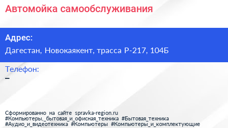 Автомойка самообслуживания по адресу Дагестан, Новокаякент, трасса Р-217, 104Б в дальнейшем Организация, размещена в следующих категориях: