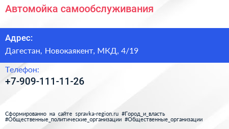 Автомойка самообслуживания по адресу Дагестан, Новокаякент, МКД, 4/19 в дальнейшем Организация, размещена в следующих категориях: