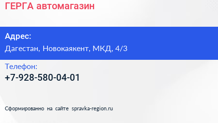 ГЕРГА, автомагазин по адресу Дагестан, Новокаякент, МКД, 4/3 в дальнейшем Организация, размещена в следующих категориях: