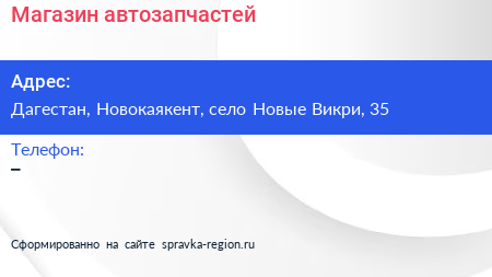 Магазин автозапчастей по адресу Дагестан, Новокаякент, село Новые Викри, 35 в дальнейшем Организация, размещена в следующих категориях:
