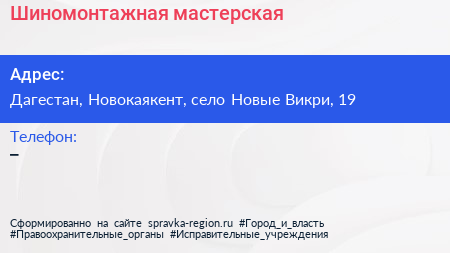 Шиномонтажная мастерская по адресу Дагестан, Новокаякент, село Новые Викри, 19 в дальнейшем Организация, размещена в следующих категориях: