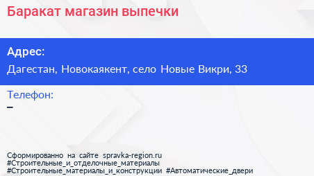 Баракат, магазин выпечки по адресу Дагестан, Новокаякент, село Новые Викри, 33 в дальнейшем Организация, размещена в следующих категориях: