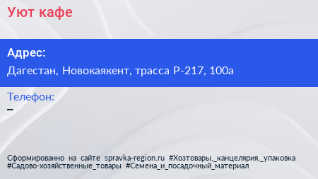 Уют, кафе по адресу Дагестан, Новокаякент, трасса Р-217, 100а в дальнейшем Организация, размещена в следующих категориях: