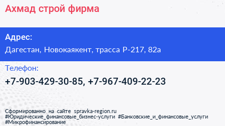 Ахмад строй, фирма по адресу Дагестан, Новокаякент, трасса Р-217, 82а в дальнейшем Организация, размещена в следующих категориях: