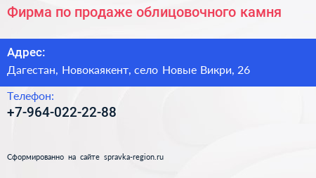 Фирма по продаже облицовочного камня по адресу Дагестан, Новокаякент, село Новые Викри, 26 в дальнейшем Организация, размещена в следующих категориях:
