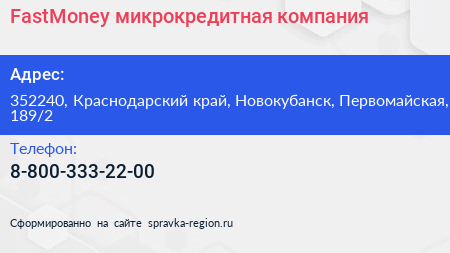 FastMoney, микрокредитная компания по адресу 352240, Краснодарский край, Новокубанск, Первомайская, 189/2 в дальнейшем Организация, размещена в следующих категориях: