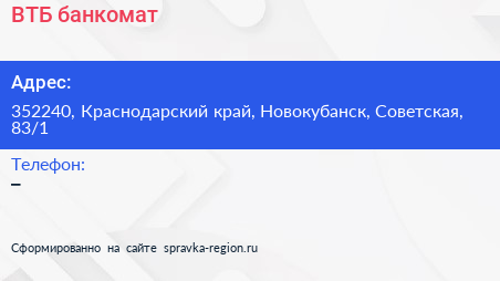 ВТБ, банкомат по адресу 352240, Краснодарский край, Новокубанск, Советская, 83/1 в дальнейшем Организация, размещена в следующих категориях: