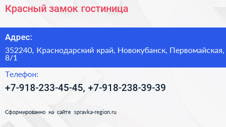 Красный замок, гостиница по адресу 352240, Краснодарский край, Новокубанск, Первомайская, 8/1 в дальнейшем Организация, размещена в следующих категориях: