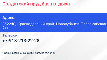 Солдатский пруд, база отдыха по адресу 352240, Краснодарский край, Новокубанск, Первомайская, 69в в дальнейшем Организация, размещена в следующих категориях: