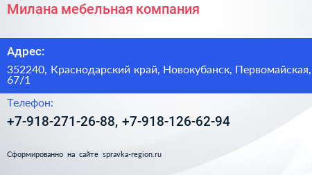 Милана, мебельная компания по адресу 352240, Краснодарский край, Новокубанск, Первомайская, 67/1 в дальнейшем Организация, размещена в следующих категориях: