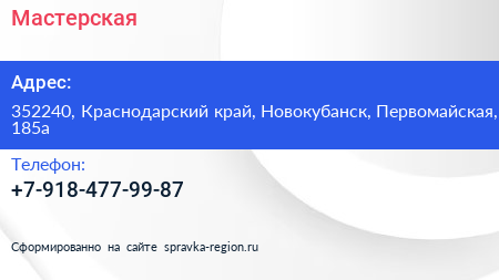 Мастерская по адресу 352240, Краснодарский край, Новокубанск, Первомайская, 185а в дальнейшем Организация, размещена в следующих категориях: