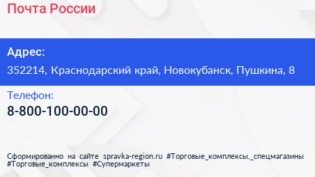 Почта России по адресу 352214, Краснодарский край, Новокубанск, Пушкина, 8 в дальнейшем Организация, размещена в следующих категориях: