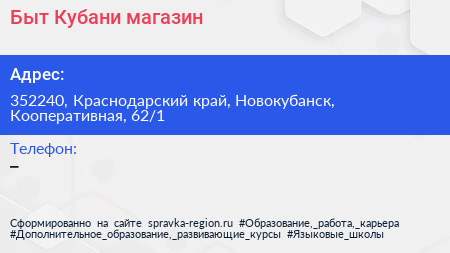 Быт Кубани, магазин по адресу 352240, Краснодарский край, Новокубанск, Кооперативная, 62/1 в дальнейшем Организация, размещена в следующих категориях: