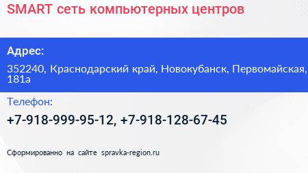 SMART, сеть компьютерных центров по адресу 352240, Краснодарский край, Новокубанск, Первомайская, 181а в дальнейшем Организация, размещена в следующих категориях: