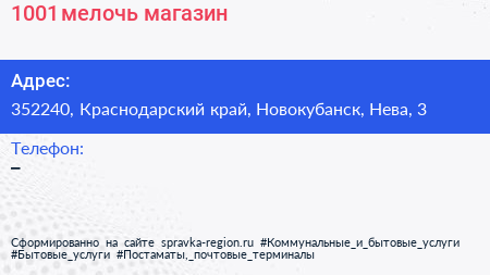 1001 мелочь, магазин по адресу 352240, Краснодарский край, Новокубанск, Нева, 3 в дальнейшем Организация, размещена в следующих категориях: