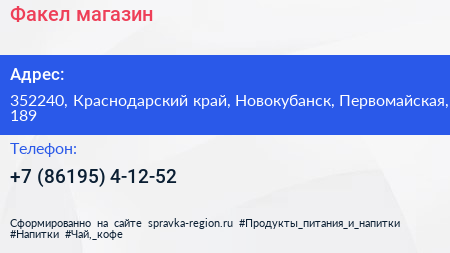 Факел, магазин по адресу 352240, Краснодарский край, Новокубанск, Первомайская, 189 в дальнейшем Организация, размещена в следующих категориях: