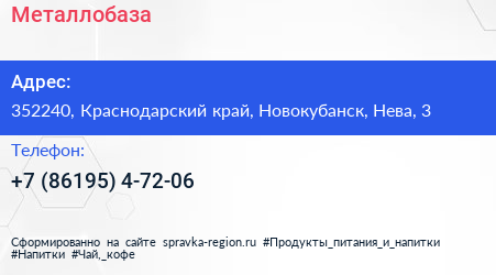 Металлобаза по адресу 352240, Краснодарский край, Новокубанск, Нева, 3 в дальнейшем Организация, размещена в следующих категориях: